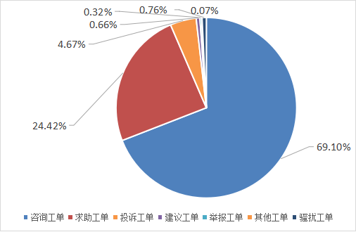 咨询类24002件,占比69.10%,主要涉及医疗医保、卫计健康、人力保障、住房保障、治安交通、市监消保、学校教育、城乡建设、邮政通信等问题;