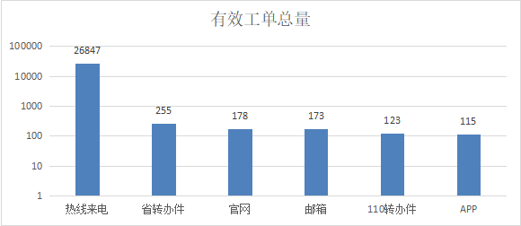 12345热线共登记有效工单27691件(其中通过“热线来电”渠道受理工单26847件、“省转办件”渠道受理工单255件、“官网”渠道受理工单178件、“邮箱”渠道受理工单173件、“110转办件”渠道受理工单123件、“APP”渠道受理工单115件)。