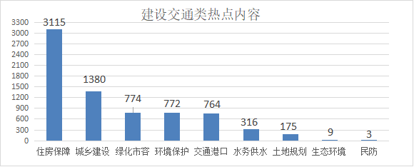 1.建设交通类诉求共7308件,其中住房保障居多,共3115件,占比42.63%;城乡建设1380件,占比18.89%;绿化市容774件,占比10.60%;环境保护772件,占比10.56%;交通港口764件,占比10.45%;水务供水316件,占比4.32%;土地规划175件,占比2.39%;生态环境9件,占比0.12%;民防3件,占比0.04%。