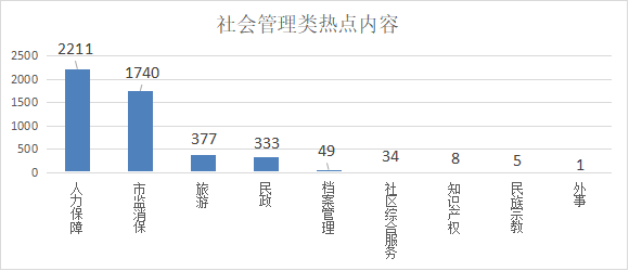 2.社会管理诉求共4758件,其中人力保障居多,共2211件,占比46.47%;市监消保1740件,占比36.57%;旅游377件,占比7.92%;民政333件,占比7.00%;档案管理49件,占比1.03%;社区综合服务34件,占比0.71%;知识产权8件,占比0.17%;民族宗教5件,占比0.11%;外事1件,占比0.02%。