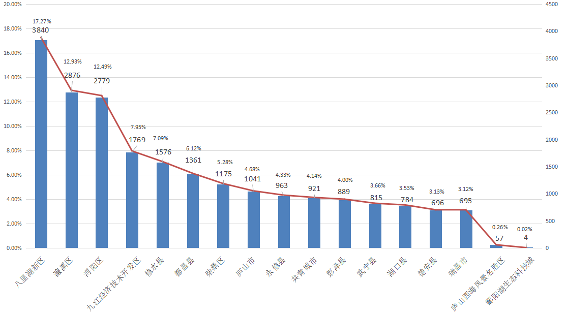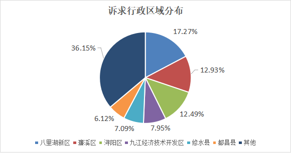 从企业群众诉求行政区域分布占比来看,八里湖新区诉求量最高,共计3840件,占比17.27%;濂溪区诉求量其次,共计2876件,占比12.93%;浔阳区诉求量第三,共计2779件,占比12.49%。