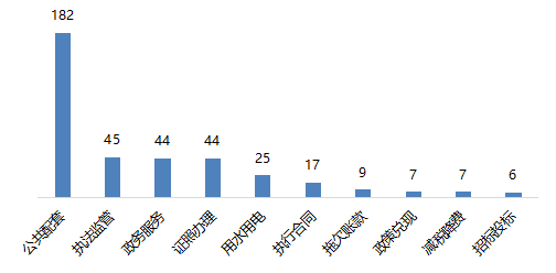 市场主体问题中,主要涉及公共配套182条、执法监管45条、政务服务44条、证照办理44条、用水电气25条、执行合同17条、拖欠账款9条、政策兑现7条、减税降费7条、招标投标6条等。