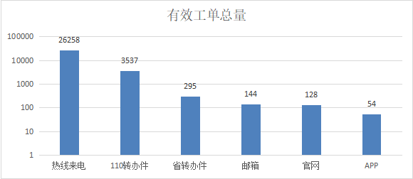 12345热线共登记有效工单30416件(其中通过“热线来电”渠道受理工单26258件、“110转办件”渠道受理工单3537件、“省转办件”渠道受理工单295件、“邮箱”渠道受理工单144件、“官网”渠道受理工单128件、“APP”渠道受理工单54件)。