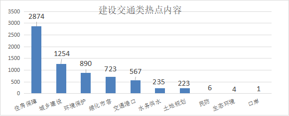 1.建设交通类诉求共6777件,其中住房保障居多,共2874件,占比42.41%;城乡建设1254件,占比18.50%;环境保护890件,占比13.13%;绿化市容723件,占比10.67%;交通港口567件,占比8.37%;水务供水235件,占比3.47%;土地规划223件,占比3.29%;民防6件,占比0.09%;生态环境4件,占比0.06%;口岸1件,占比0.01%。