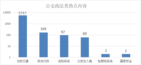 2.公安政法类诉求共6047件,其中治安交通居多,共5717件,占比94.55%;司法行政169件,占比2.80%;法院系统97件,占比1.60%;公安出入境60件,占比0.99%;检察院系统2件,占比0.03%;国家安全2件,占比0.03%。