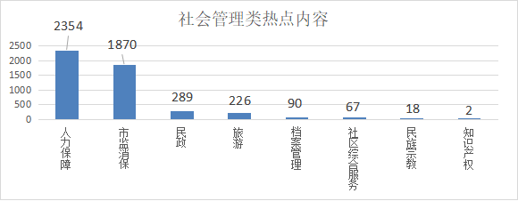 3.社会管理诉求共4916件,其中人力保障居多,共2354件,占比47.88%;市监消保1870件,占比38.04%;民政289件,占比5.88%;旅游226件,占比4.60%;档案管理90件,占比1.83%;社区综合服务67件,占比1.36%;民族宗教18件,占比0.37%;知识产权2件,占比0.04%。