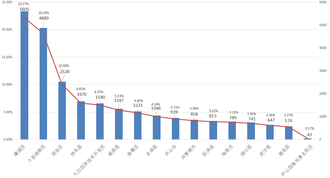 从企业群众诉求行政区域分布总体来看,6月份九江地区诉求工单共25281件。(说明:不包含市直单位数据)