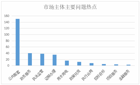 市场主体问题中,主要涉及公共配套150件、政务服务40件、执法监管38件、证照办理35件、用水电气16件、政策兑现12件、执行合同8件、招标投标5件、项目服务4件、金融服务3件等。