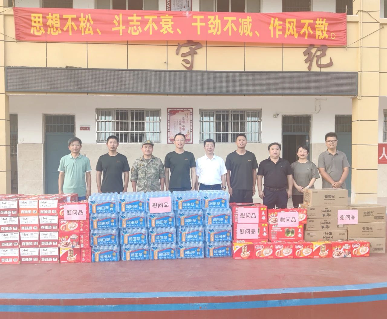 7月9日下午,永修县九合乡人民政府走访慰问支援九合联圩抢险的江西武警机动支队某部官兵,县长朱超出席,县委常委、县人武部政委吴鹤平、县人大常委会副主任柯园龙、九江组织干部学院副院长江立萍、县老年体协主席李小芳陪同参加慰问活动。