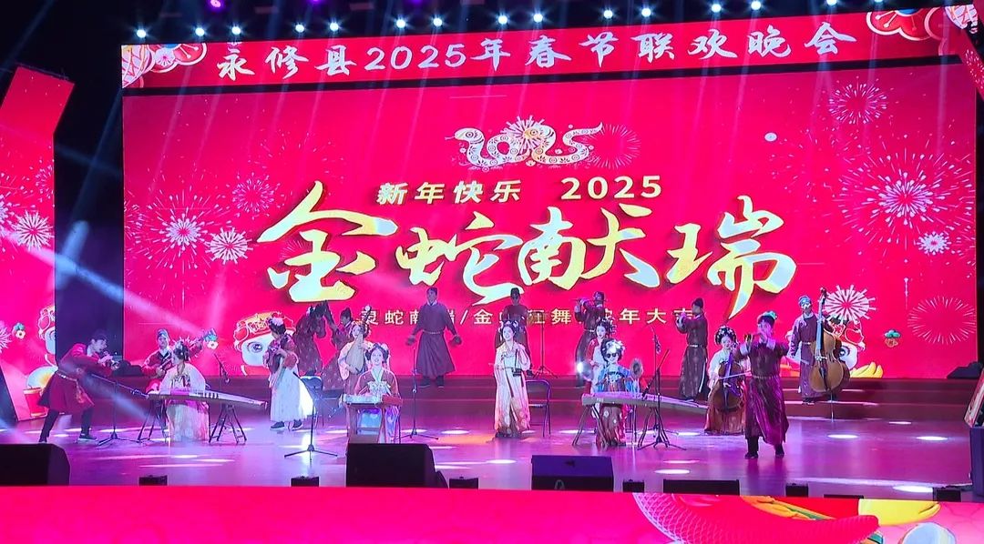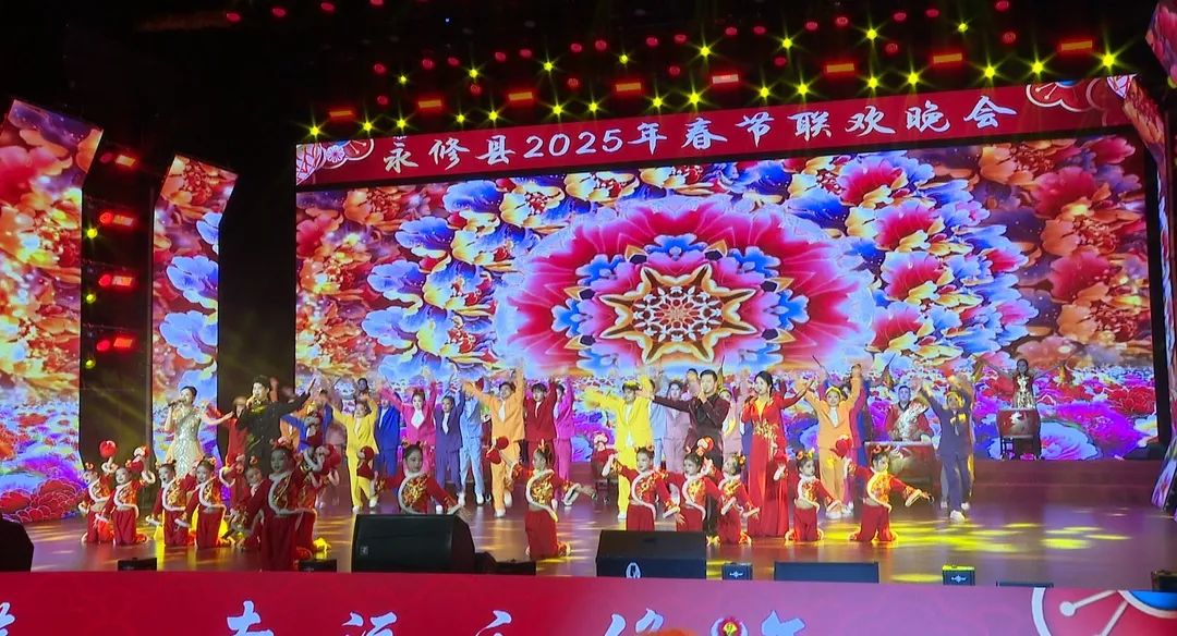 随后,《奔跑的青春》等舞蹈,展现了永修群众朝气蓬勃、积极向上的精神风貌,乐器合奏《红花满山开》《金蛇狂舞》营造出欢快而喜庆的节日氛围,情景朗诵《祖国不会忘记》和快板《说永修》,抒发了对祖国的深切热爱。歌曲《天地龙鳞》等以动人的旋律,为观众送上了新年的祝福与期盼。情景剧《坚守》通过动人的故事,彰显了全县党员干部群众在防洪抢险中万众一心、坚韧不拔的精神风貌。丫丫戏等永修非遗文化情景秀也纷纷亮相。