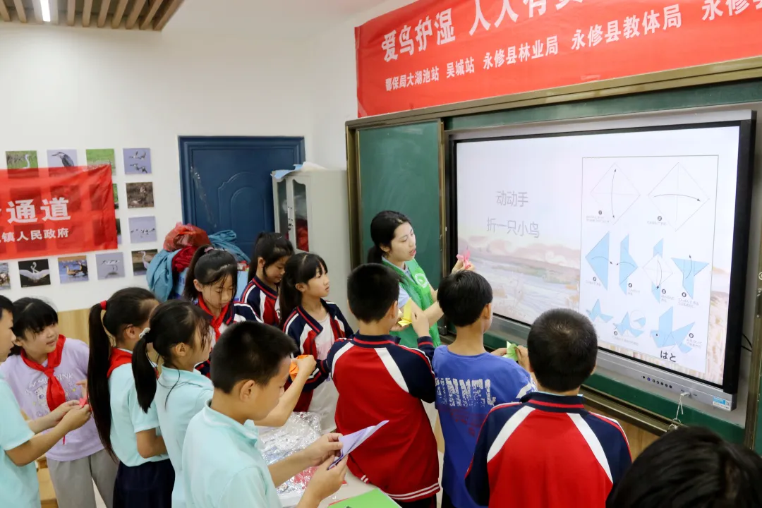 活动期间,工作人员以专题讲座的形式,通过生动的PPT展示,向学生和群众讲解《鄱阳湖的奇趣生活》系列课程,从鄱阳湖自然特征、旗舰动植物、湿地保护等知识科普,到手工折纸游戏、生物多样性宣传栏参观,让学生们深入领悟鄱阳湖生态保护的目的和意义,把生态环保理念融入日常生活,身体力行,向绿出发。