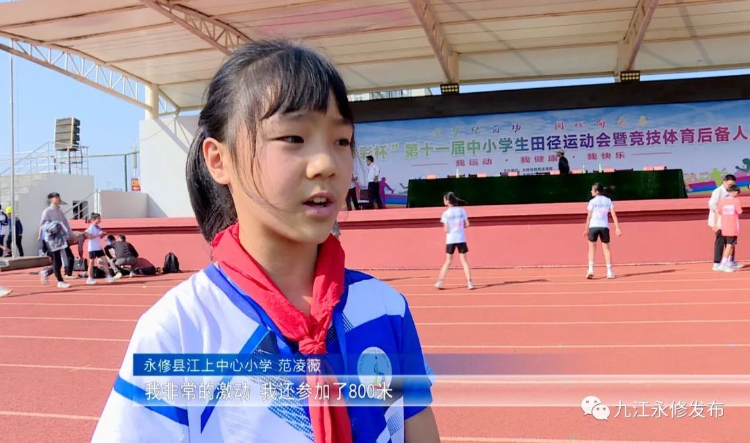 “今天,我非常激动,因为我参加了800米跑,我希望能得到一个名次,为我们学校增光。”永修县江上中心小学范凌薇说。