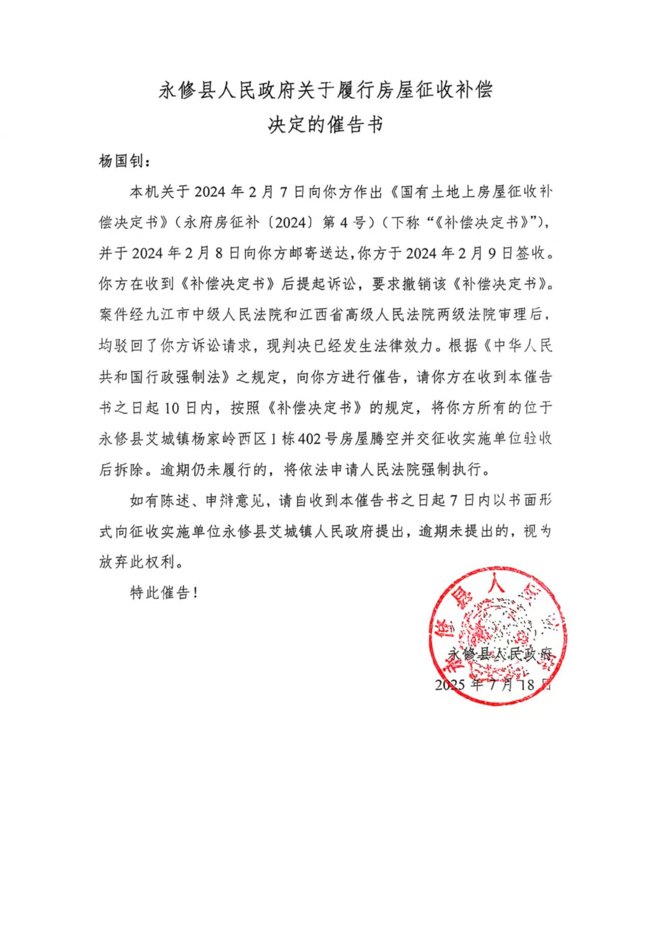 永修县人民政府关于履行房屋征收补偿决定的催告书(杨国钊)