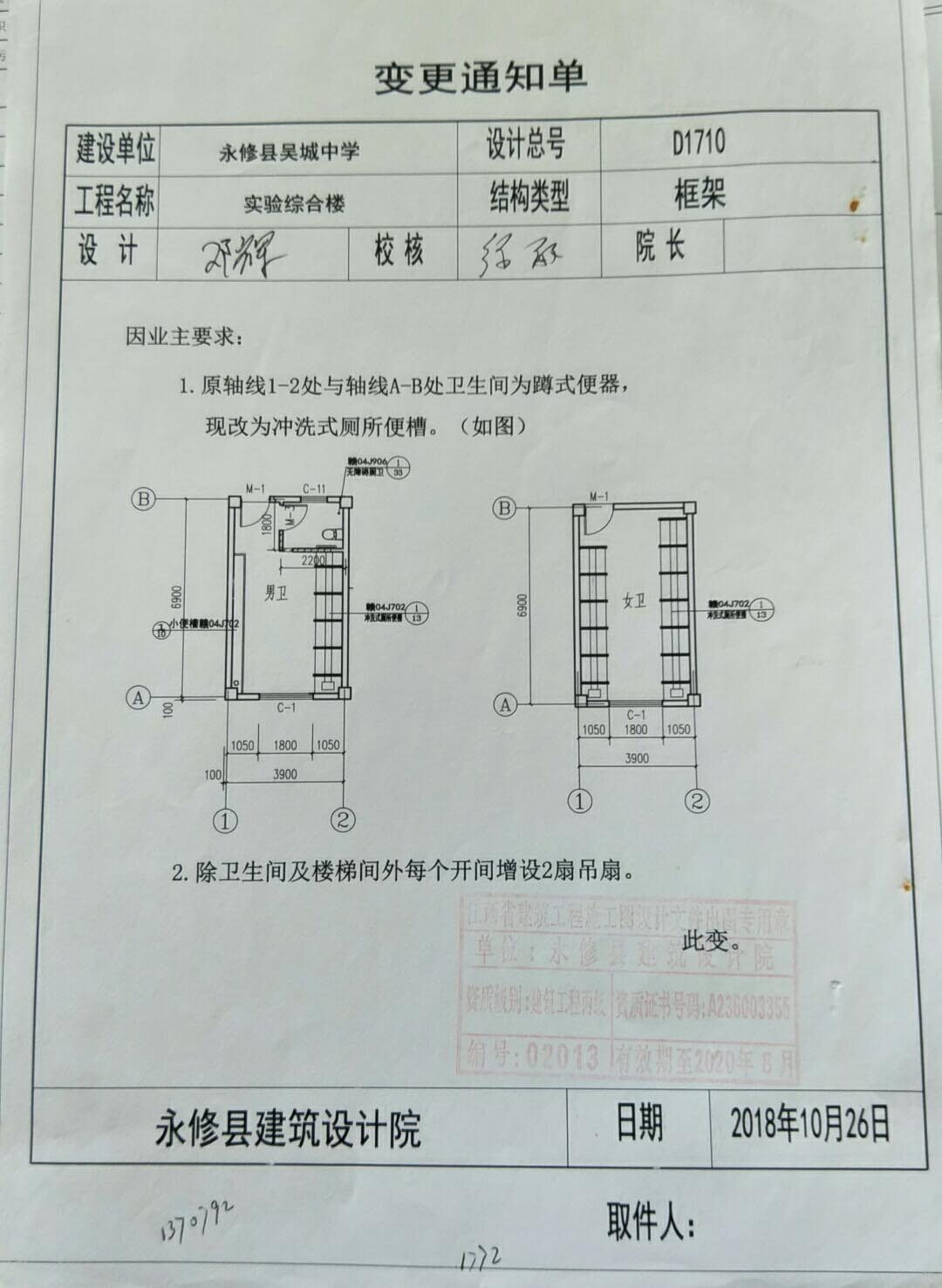 永修县吴城中学实验综合楼工程设计变更告知单