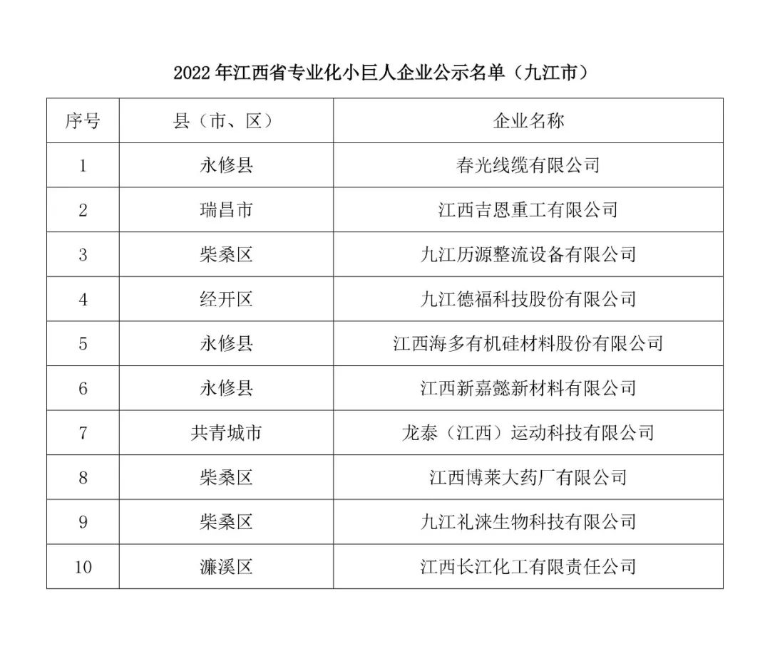 11月28日,省工信厅网站公示2022年江西省专业化“小巨人”企业名单,全省82家企业榜上有名,我县春光线缆有限公司、江西海多有机硅材料股份有限公司和江西新嘉懿新材料有限公司3家企业入选。省级专业化“小巨人”企业是指坚持专业化发展战略,持续专注行业细分领域,细分市场地位突出,质量品牌优,创新能力强,管理科学规范,实力业绩过硬,具有良好发展前景和成长潜力的企业。