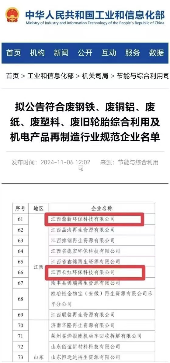 11月6日,工信部发布了《拟公告符合废钢铁、废铜铝、废纸、废塑料、废旧轮胎综合利用及机电产品再制造行业规范企业名单》,对入围企业进行公示。我县江西鼎新环保科技有限公司和江西长红环保科技有限公司2家企业上榜。