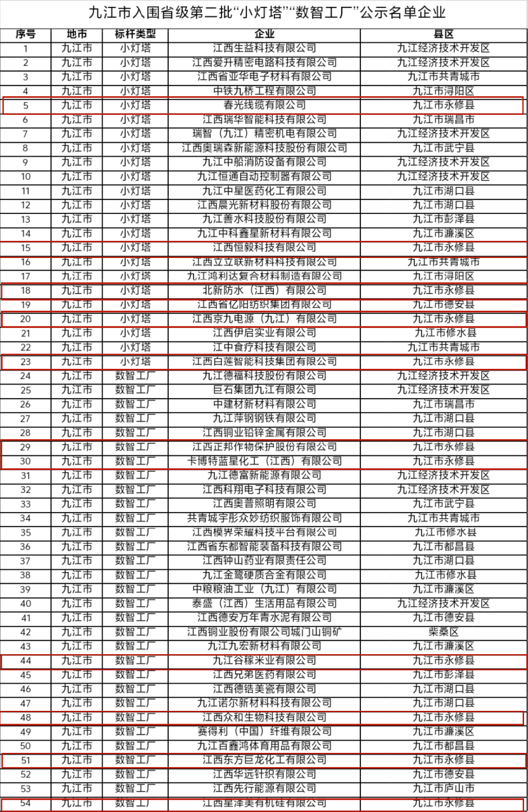 9月12日,根据江西省工业和信息化厅《关于江西省第二批“数字领航”和“数智工厂”名单的公示》《关于江西省2025年第二批次“小灯塔”企业名单的公示》,永修县入围第二批“数智工厂”和“小灯塔”企业共11家,总数列全市第1,其中,5家企业入围“小灯塔”,列全市第1,6家企业入围“数智工厂”,列全市第1。