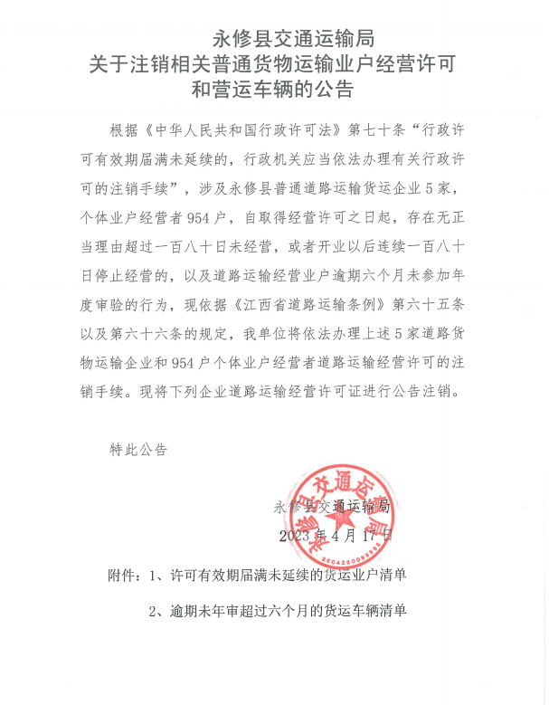 永修县交通运输局关于注销相关普通货物运输业户经营许可和营运车辆的公告