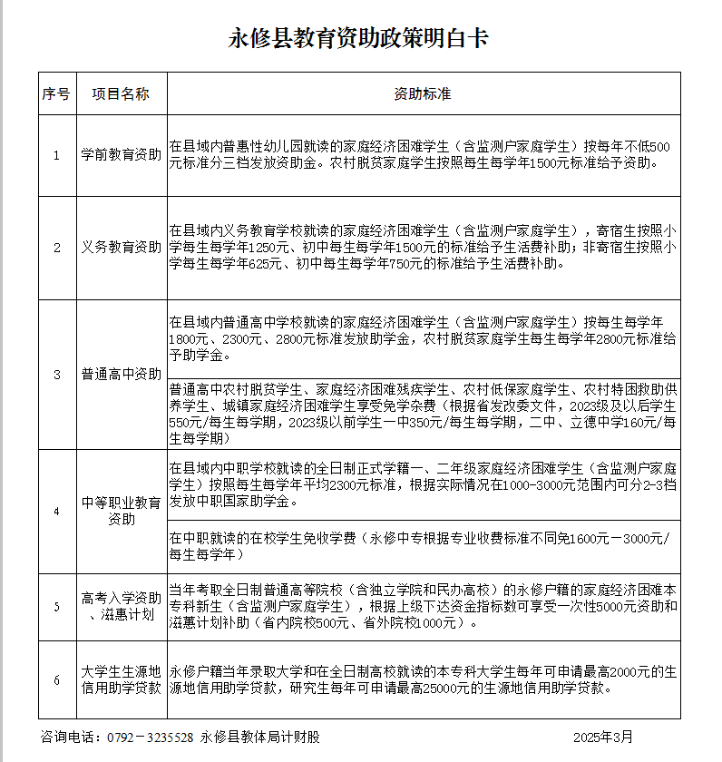 为方便广大市民了解永修县教育资助政策,现将永修县教育资助政策明白卡予以公告。