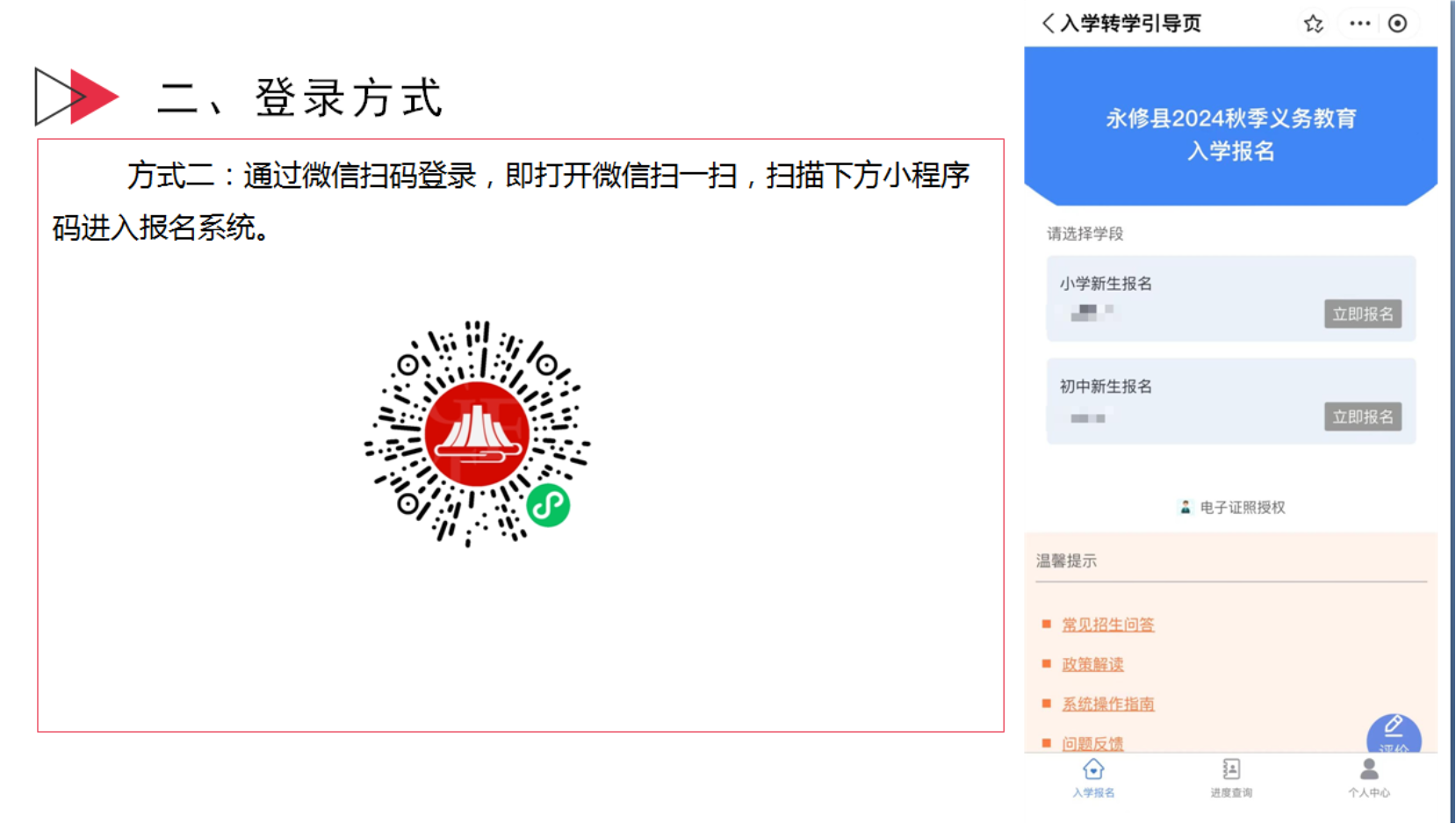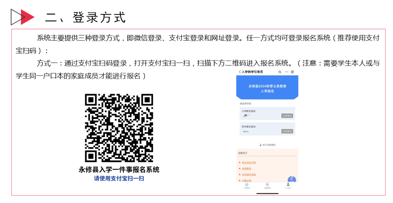 1.家长通过支付宝或微信APP扫码进入“永修县2024义务教育入学报名系统”,共享公安户籍、不动产、住建等大数据信息,信息核查将以报名系统自动校验为准。凡提供虚假证明的,将取消其预报名资格,对于触犯法律的,将移交司法机关进行查处。