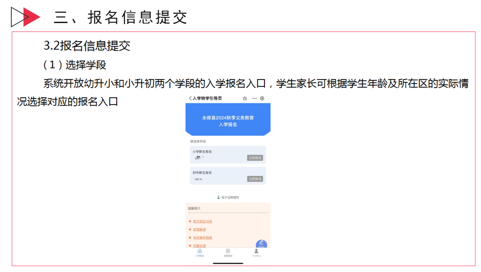 2.申请在县城区公办义务教育学校入学的,一名学生仅能通过“永修县2024义务教育入学报名系统”填报一次报名信息,不能重复报名。