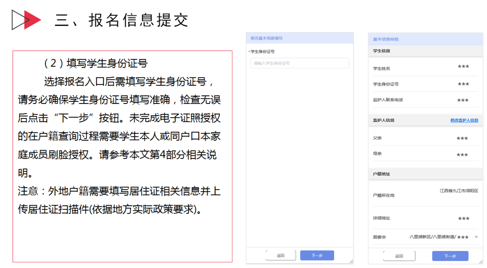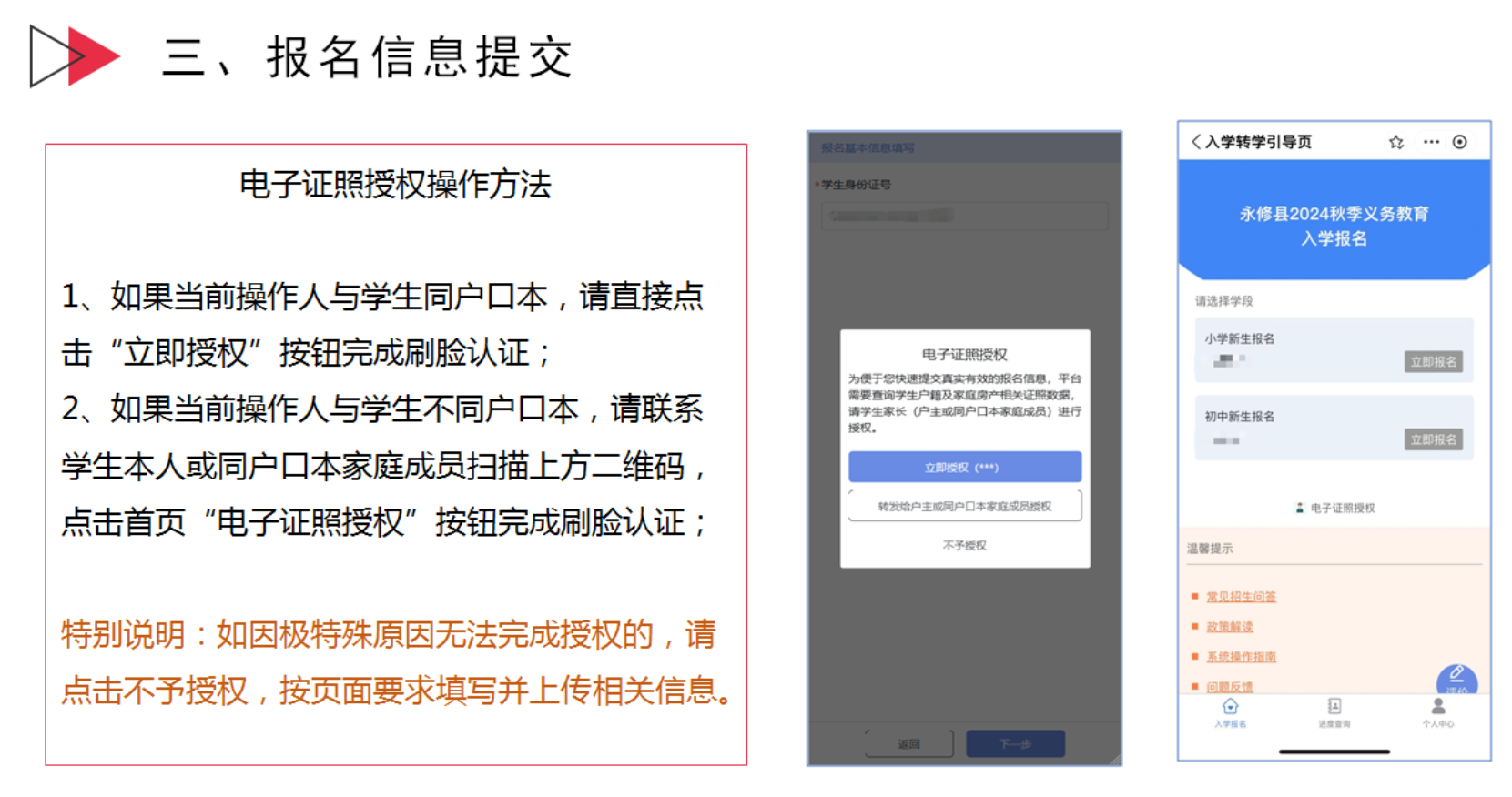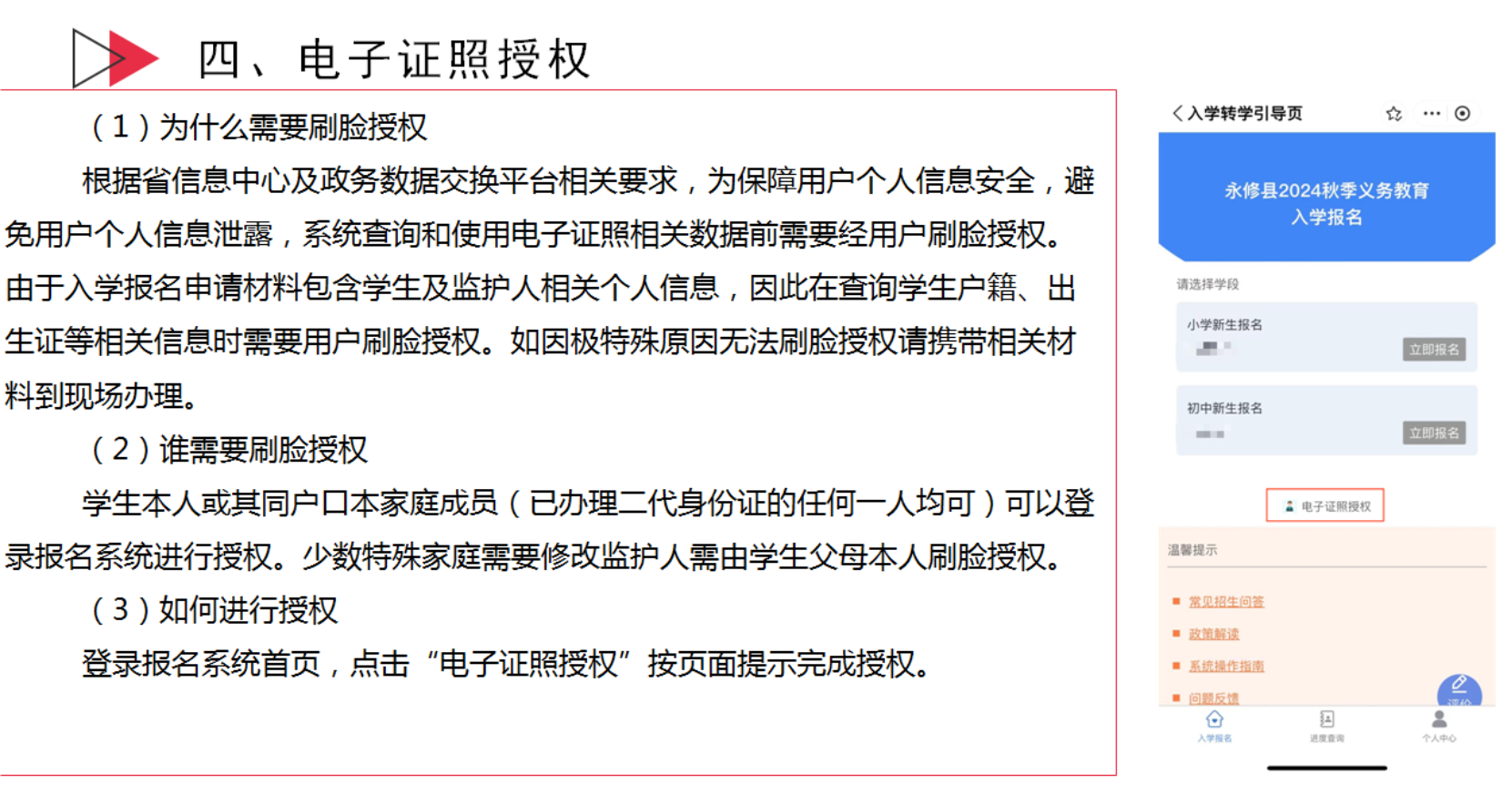 答:根据省信息中心及政务数据交换平台相关要求,为保障用户个人信息安全,避免用户个人信息泄露,系统查询和使用电子证照相关数据前需要经用户刷脸授权。由于入学报名申请材料包含学生及监护人相关个人信息。因此,在查询学生户籍、出生证等相关信息时需要用户刷脸授权。如因极特殊原因无法刷脸授权请携带相关材料到现场办理。