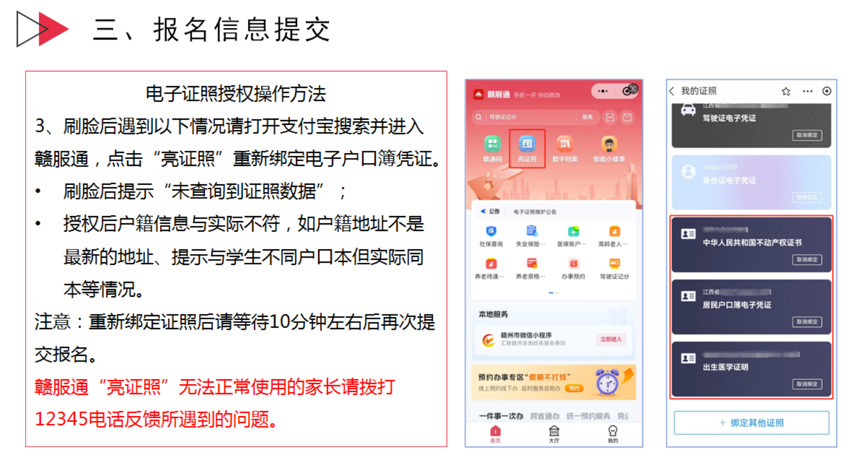 答:领取电子证照主要是便于后面报名时更加方便快捷,如您是江西省户籍则需要领取居民电子户口簿凭证,如非江西省户籍则无需操作。如您在本地区有房(不动产),为了便于后续报名操作建议领取不动产证照,无房的则无需操作。如您在“赣服通”亮证照里面没有查询到你报名所需要的房产,可以到报名时间进入系统进行报名,查询看是否有你报名所需房产,系统所对接的数据相对较全。如您的房产性质是公租房无需通过亮证照去领取绑定。
