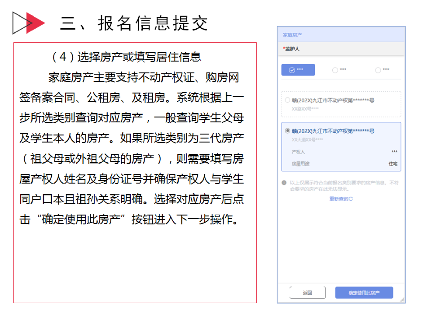 4.学生父母(或法定监护人)在城区无法定房产(有法定房产的需按法定房产学区入学),但在对应学区内自建或者购买小产权房(安置房)的,需要有购房合同(协议)、购房款付款凭证(加盖银行印章的银行转账流水)、物业费缴纳凭证、近3个月水费使用凭证、父母(或法定监护人)不动产情况查询证明等。