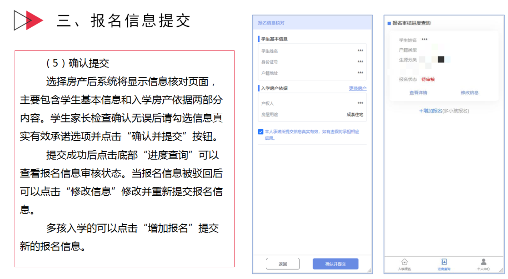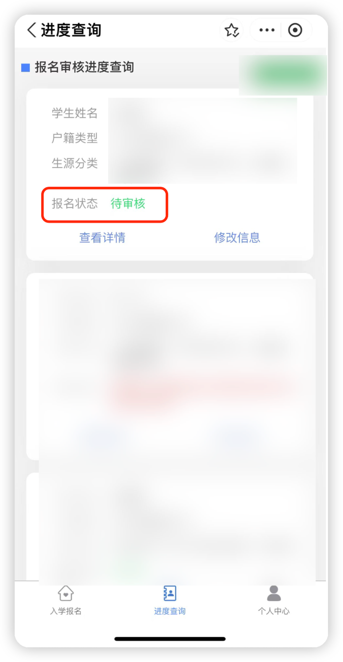 答:平台最终报名结果,以报名时最后一次提交的信息为准,请仔细核对所填报的信息是否正确。如有误,可在报名时间截止前登录平台进行修改。报名时间截止前,家长修改信息不受操作次数限制。报名时间截止后,平台关闭,家长无法再进行信息修改。具体操作流程:进入报名系统后,点击进度查询,进入进度查询页面,点击修改信息,进入修改。
