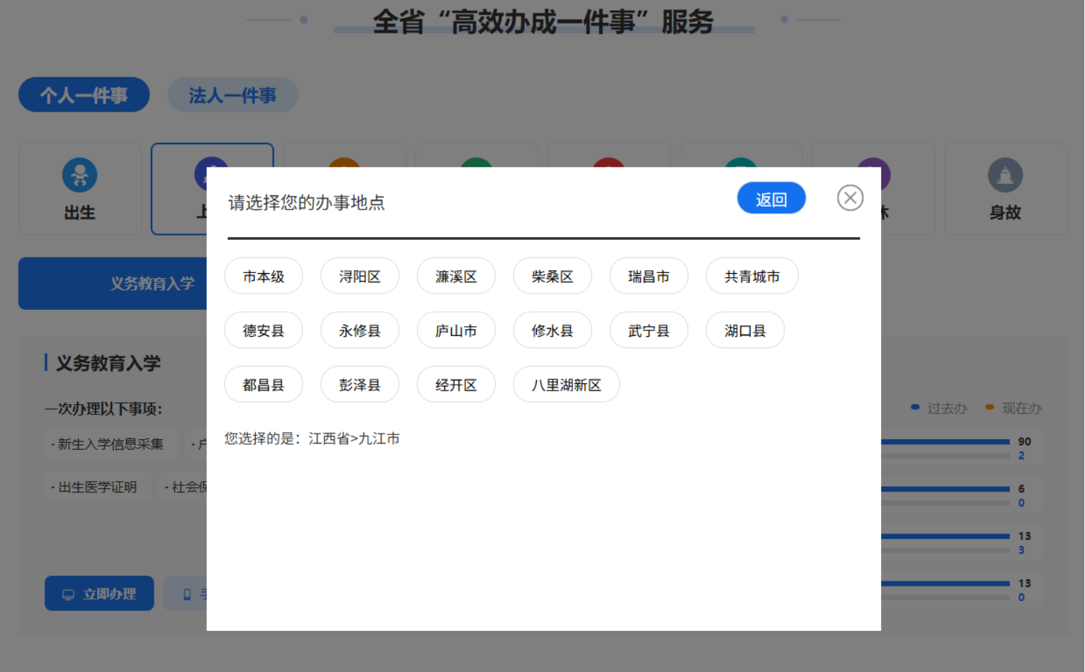 在高效办成一件事专区“上学”版块点击“立即办理”选择“永修县”即可进入。