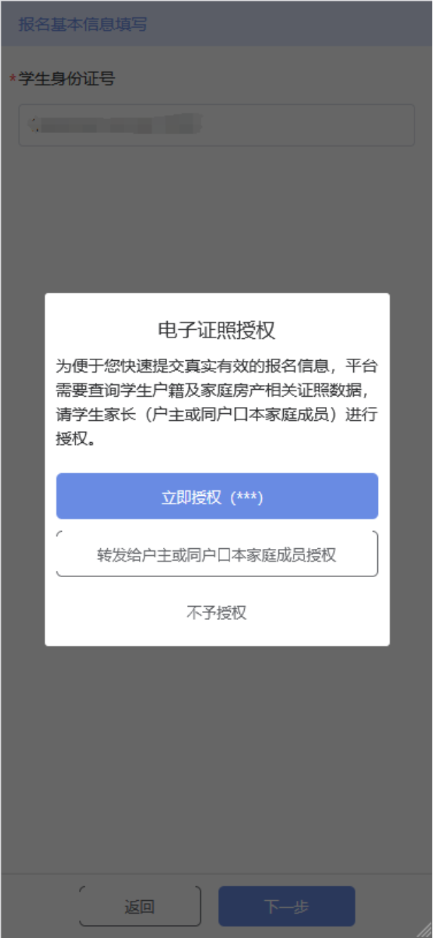 输入学生身份证号点击“下一步”按钮,系统引导学生家长授权查询学生户籍信息,学生家长按页面提示完成电子证照授权。授权成功后系统显示查询结果。