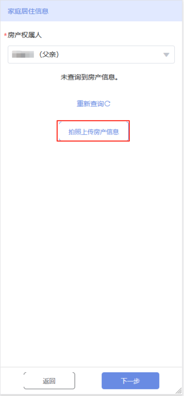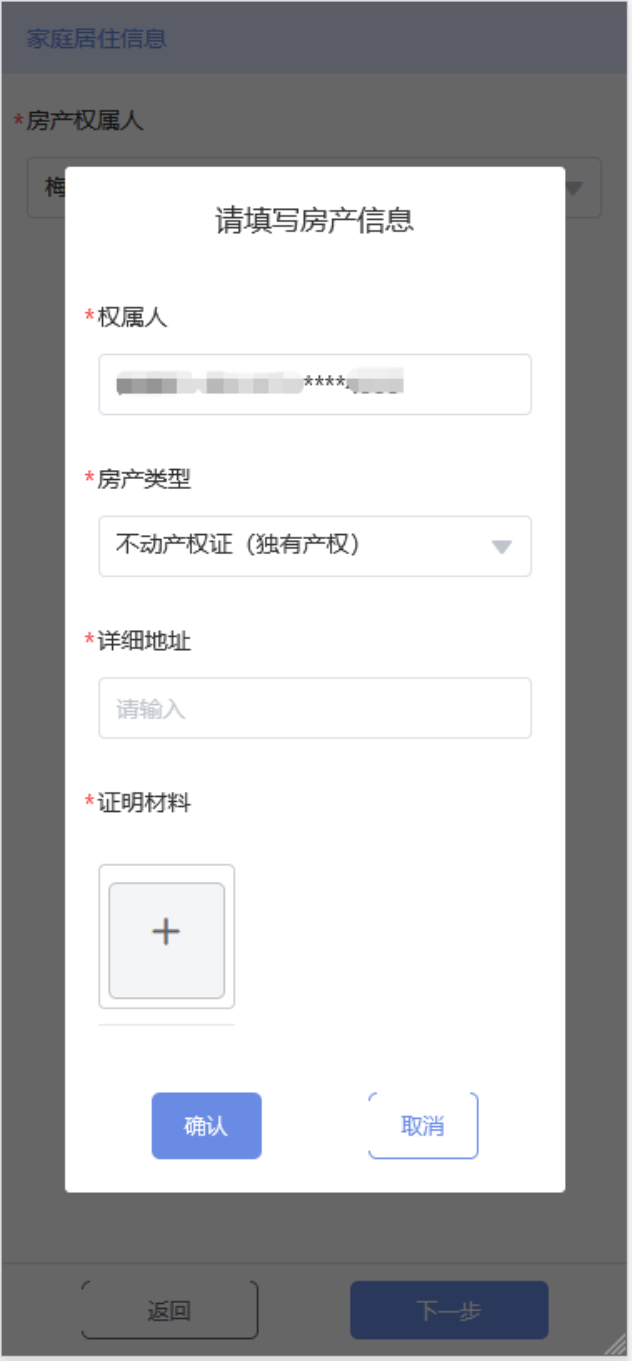 事实有房产但因房产数据查询异常等原因未查询到房产信息的,可以点击“拍照上传房产信息”按钮,填写房产地址并上传相关证明材料,点击确认按钮后即可添加房产信息。