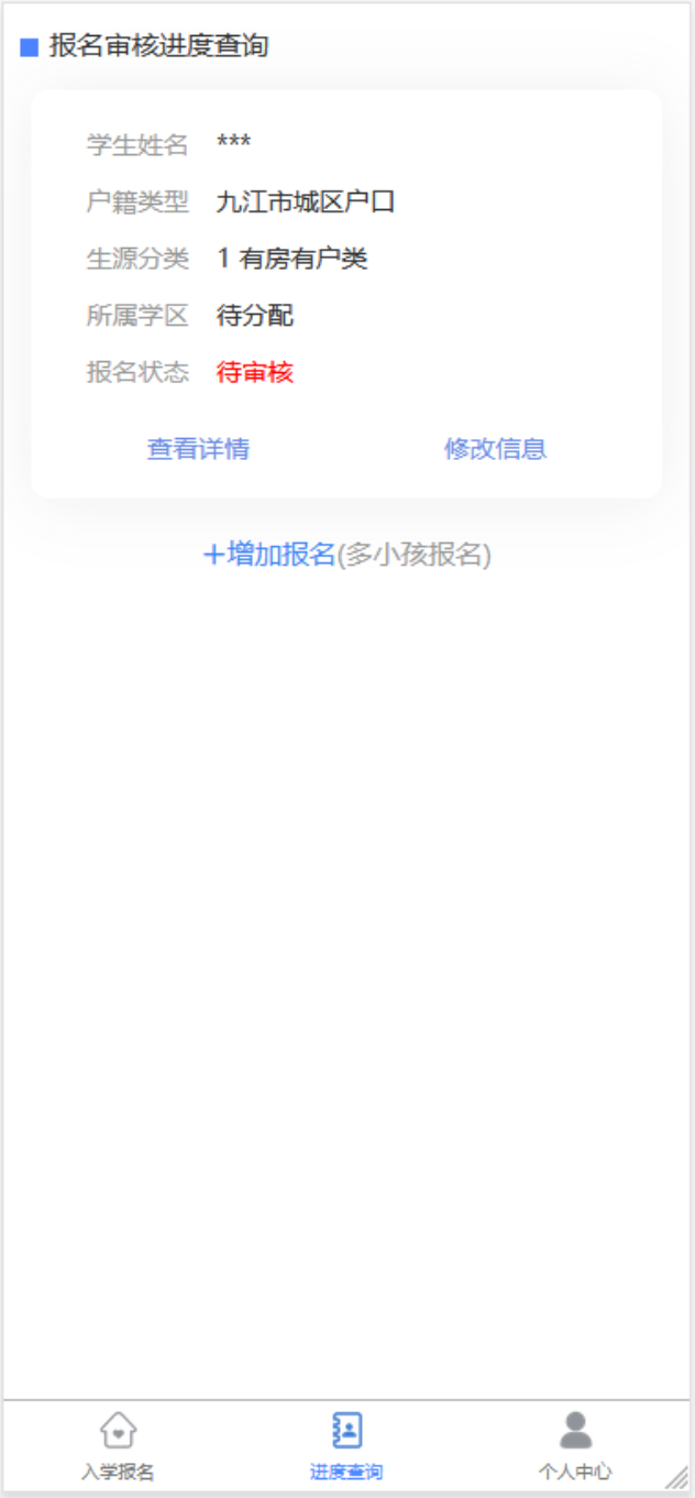 答:平台最终报名结果,以报名时最后一次提交的信息为准,请仔细核对所填报的信息是否正确。如有误,可在报名时间截止前登录平台进行修改。报名时间截止前,家长修改信息不受操作次数限制。报名时间截止后,平台关闭,家长无法再进行信息修改。具体操作流程:进入报名系统后,点击进度查询,进入进度查询页面,点击修改信息,进入修改。