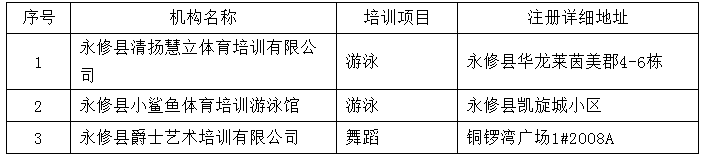 永修县“双减”工作联席会议制度职能部门县教体局、县文广新旅局、县工信局、县市监局、县住建局、县公安局、县人社局、县消防救援大队等根据《江西省文化艺术类校外培训机构管理办法(试行)》《江西省体育类校外培训机构管理办法(试行)》要求,对县内提交申请新举办的3家培训机构进行了材料审核和现场审核,并核验通过,现进行办学许可证颁发前的网上公示如下: