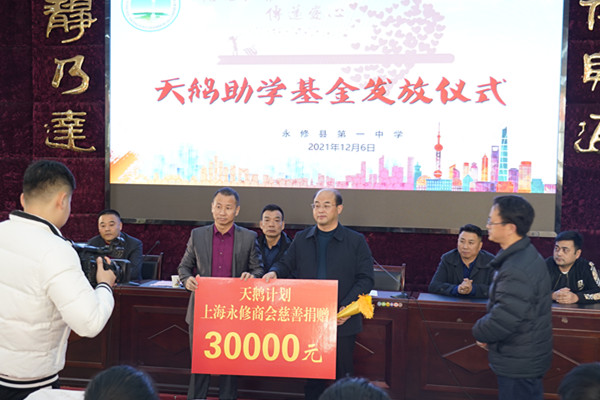 爱心无止境,助学见真情。12月6日,“天鹅计划”永修上海商会资助仪式在永修一中绍亮厅举行。县教体局一级主任科员陈卫、永修上海商会会长熊崇坤、该校校长赵玉文、副校长王斌及资助中心成员、受助学生参加了此次仪式。