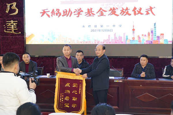 赵玉文代表永修一中向永修上海商会赠送锦旗,对永修上海商会的善行义举表示崇高的敬意和由衷的感谢。作为受赠学校,永修一中定会接下爱的火炬,化努力为行动,用优异的成绩来回报社会的关爱。(永修一中 文/陈荣;图/王宏筹)