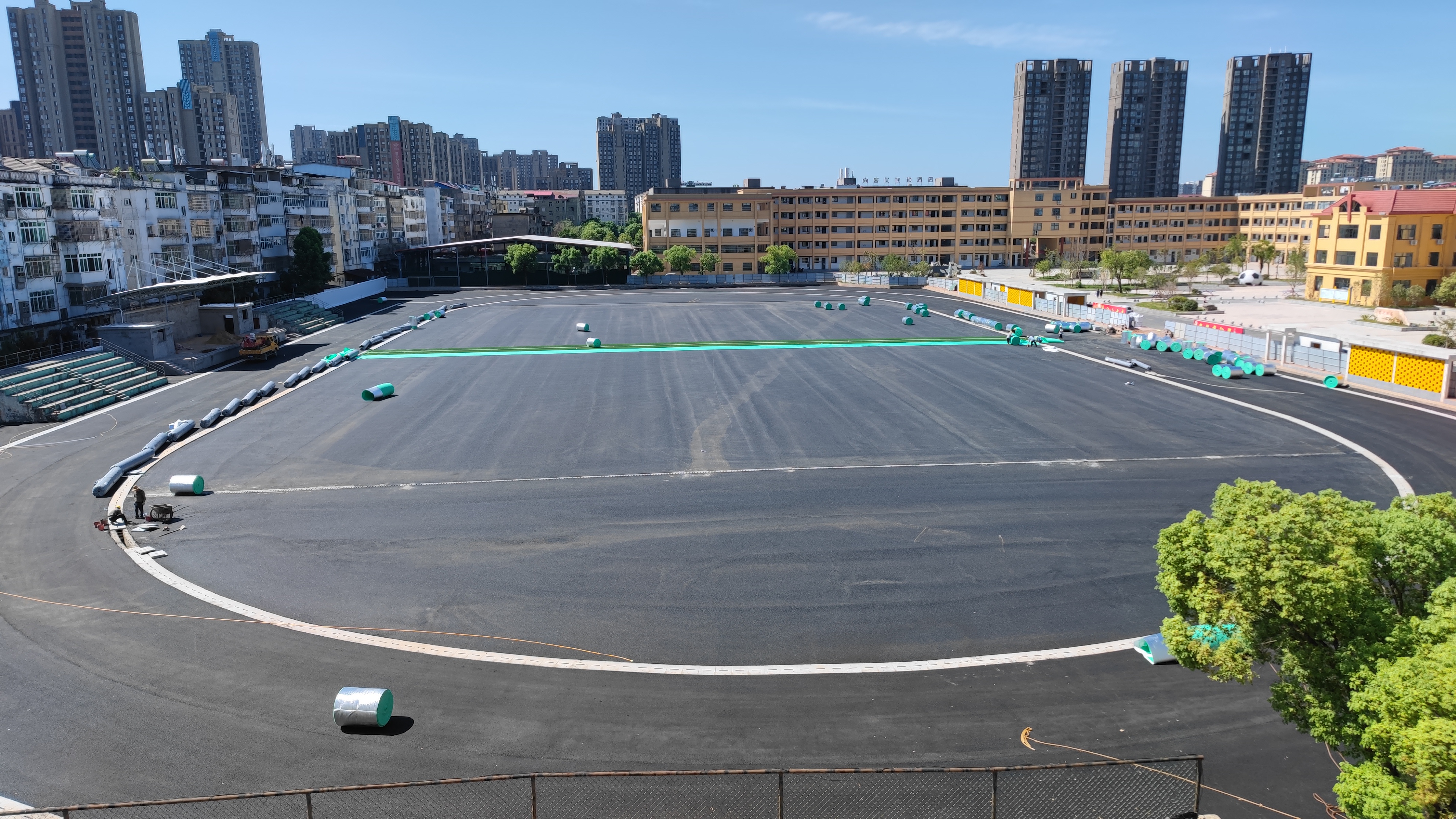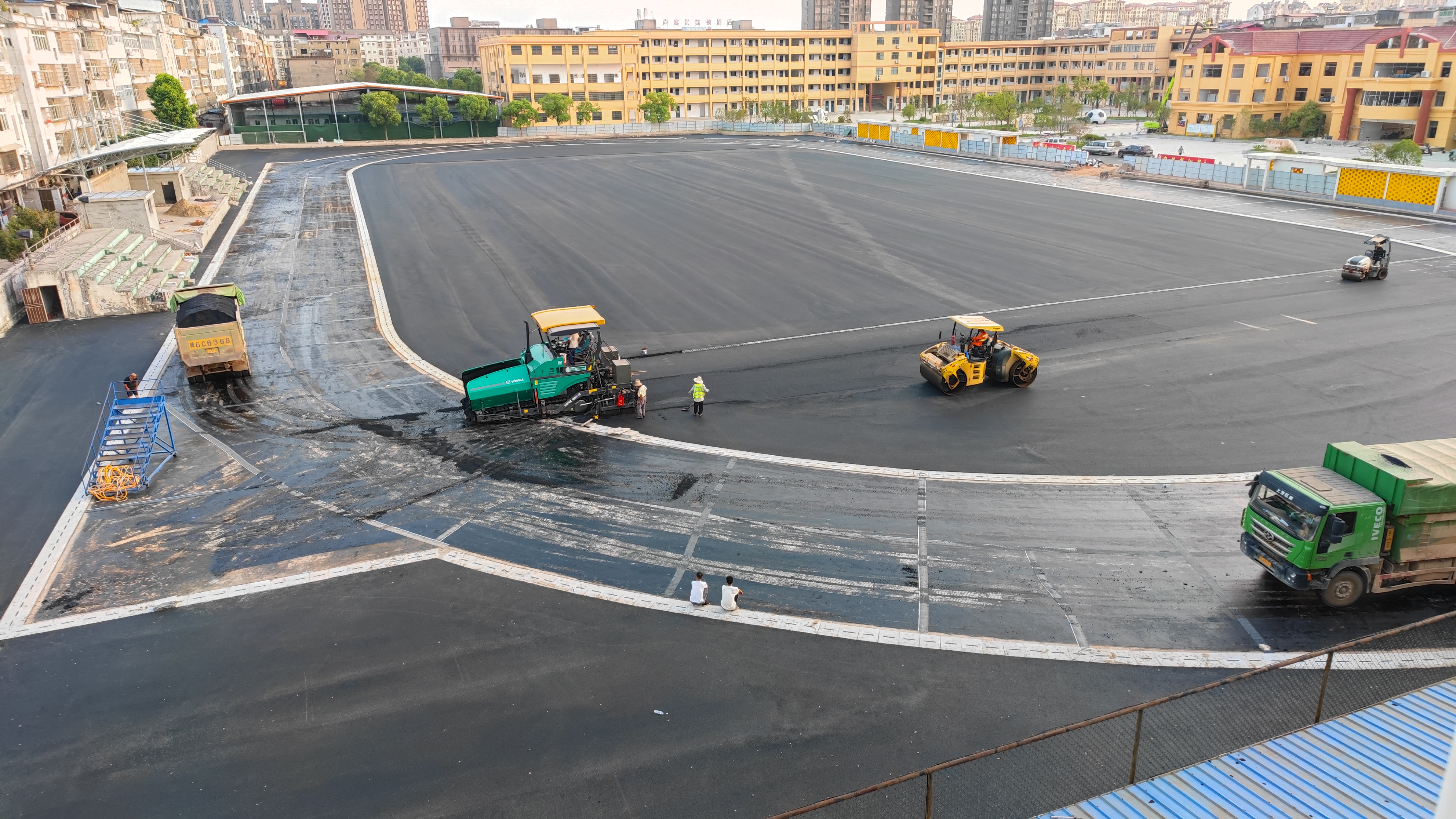 在永修县外国语学校,运动场改造工程正如火如荼地进行。施工人员操控着多台机械,正通力合作进行运动场沥青基层的摊铺和辗压,即将进行面层施工。近期天气炎热,为了保障工程进度,施工人员充分利用早晚时间抓紧施工,学校运动场几乎一天一个样。