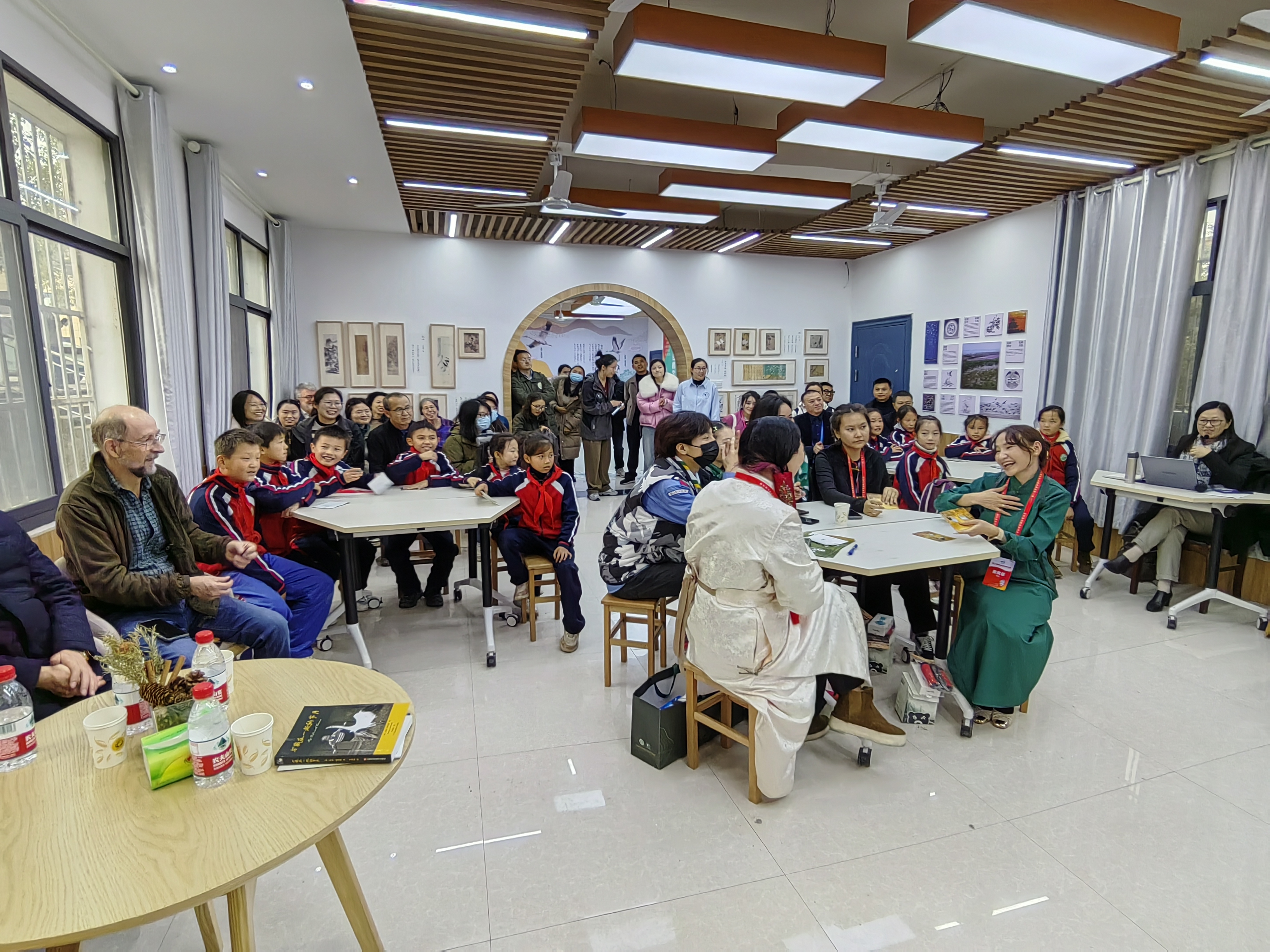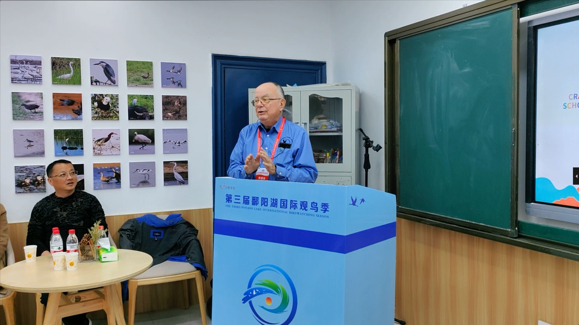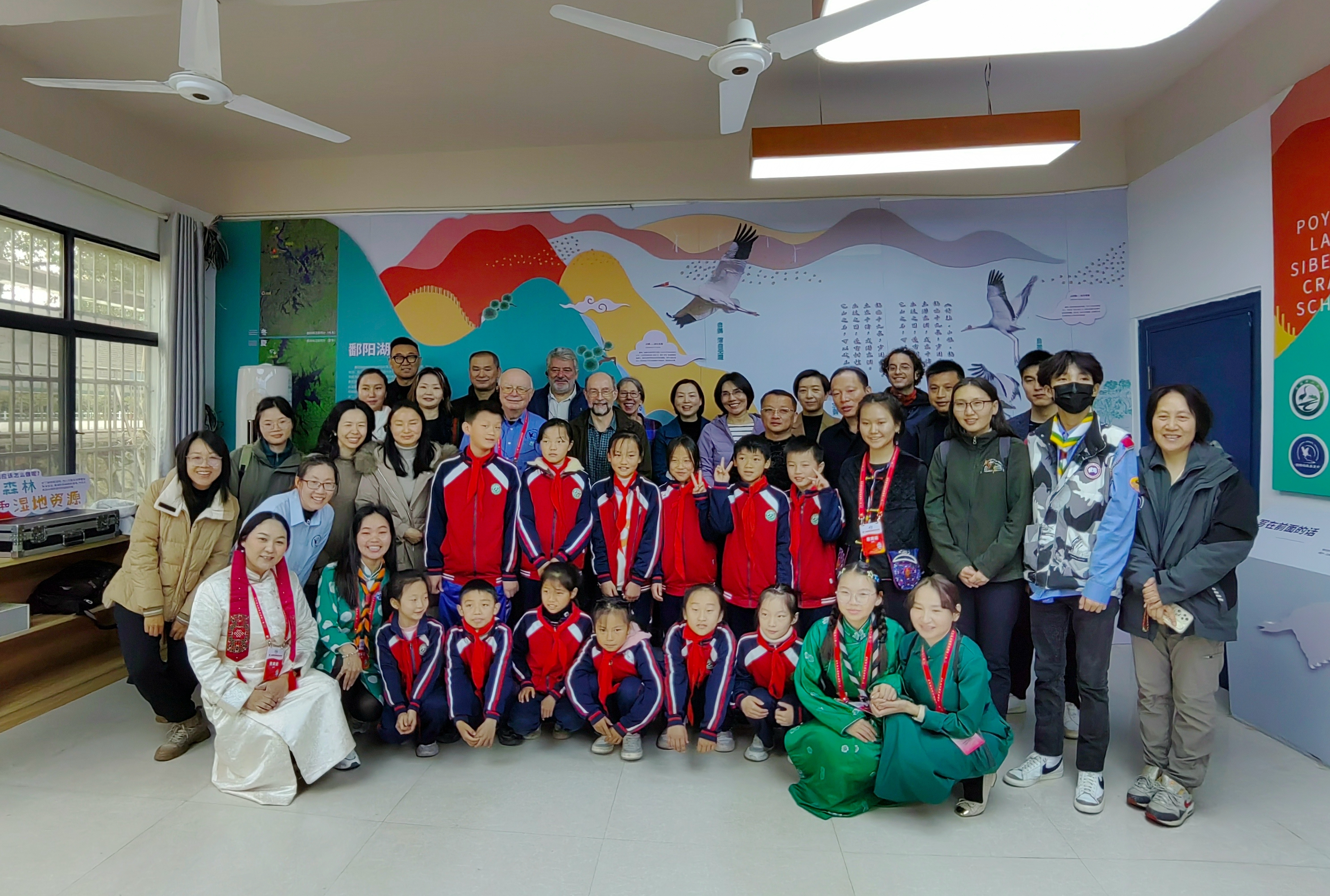 在永修县吴城中心小学“小鹤学堂”环境教育基地,国际鹤类基金会创始人乔治·阿基博向吴城中心小学和几位来自蒙古国的孩子们介绍了成立国际鹤类基金会的初衷,讲述了自己和鹤类之间的故事,仔细回答了孩子的提问,并赠送了鹤类主题书籍。