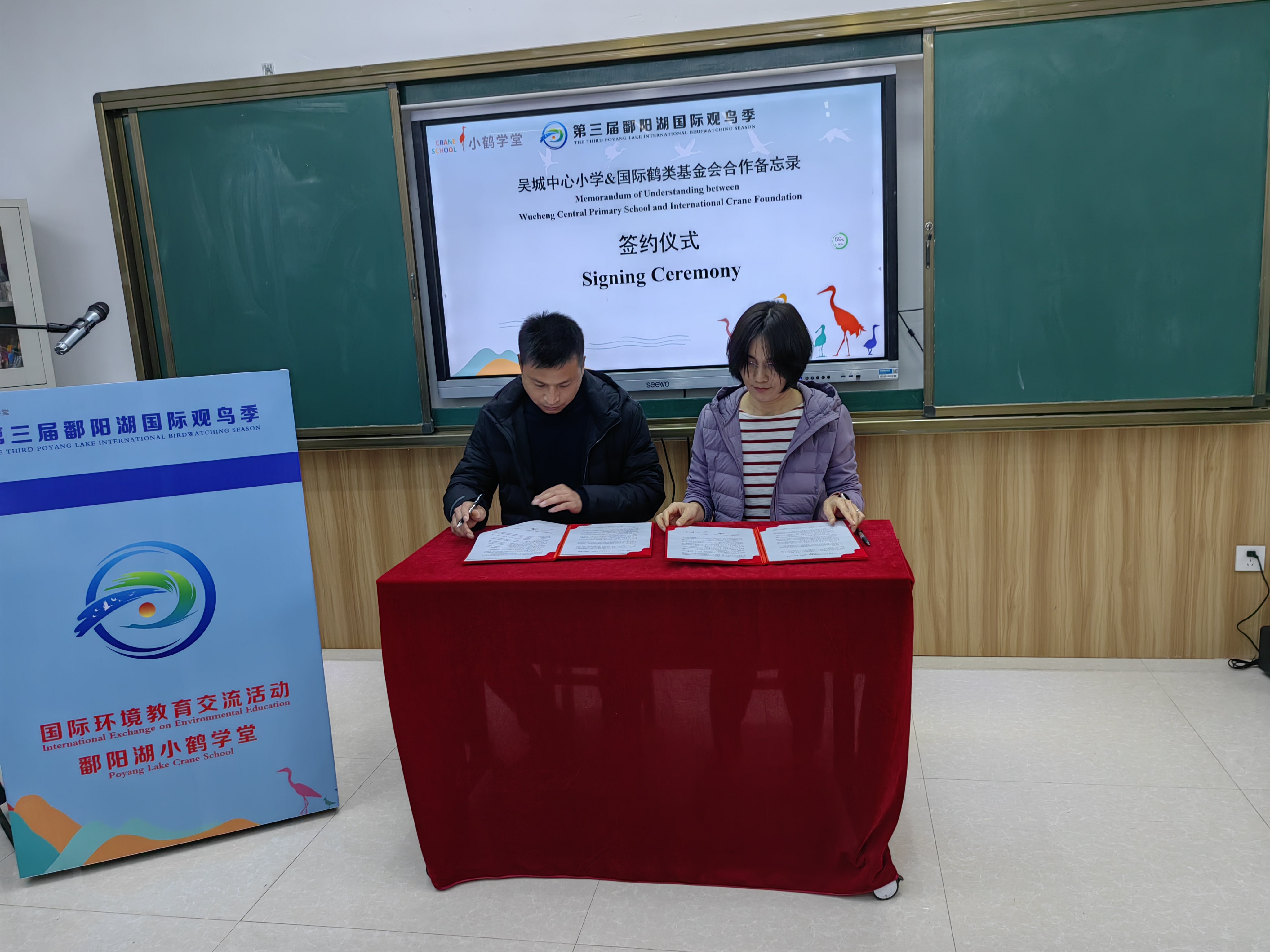 为守护以白鹤为代表的候鸟及其栖息地的安全与稳定,国际鹤类基金会北京代表处首席代表与吴城中心小学签订合作协议,共同开展以湿地和水鸟保护为特色的环境教育进课堂项目。