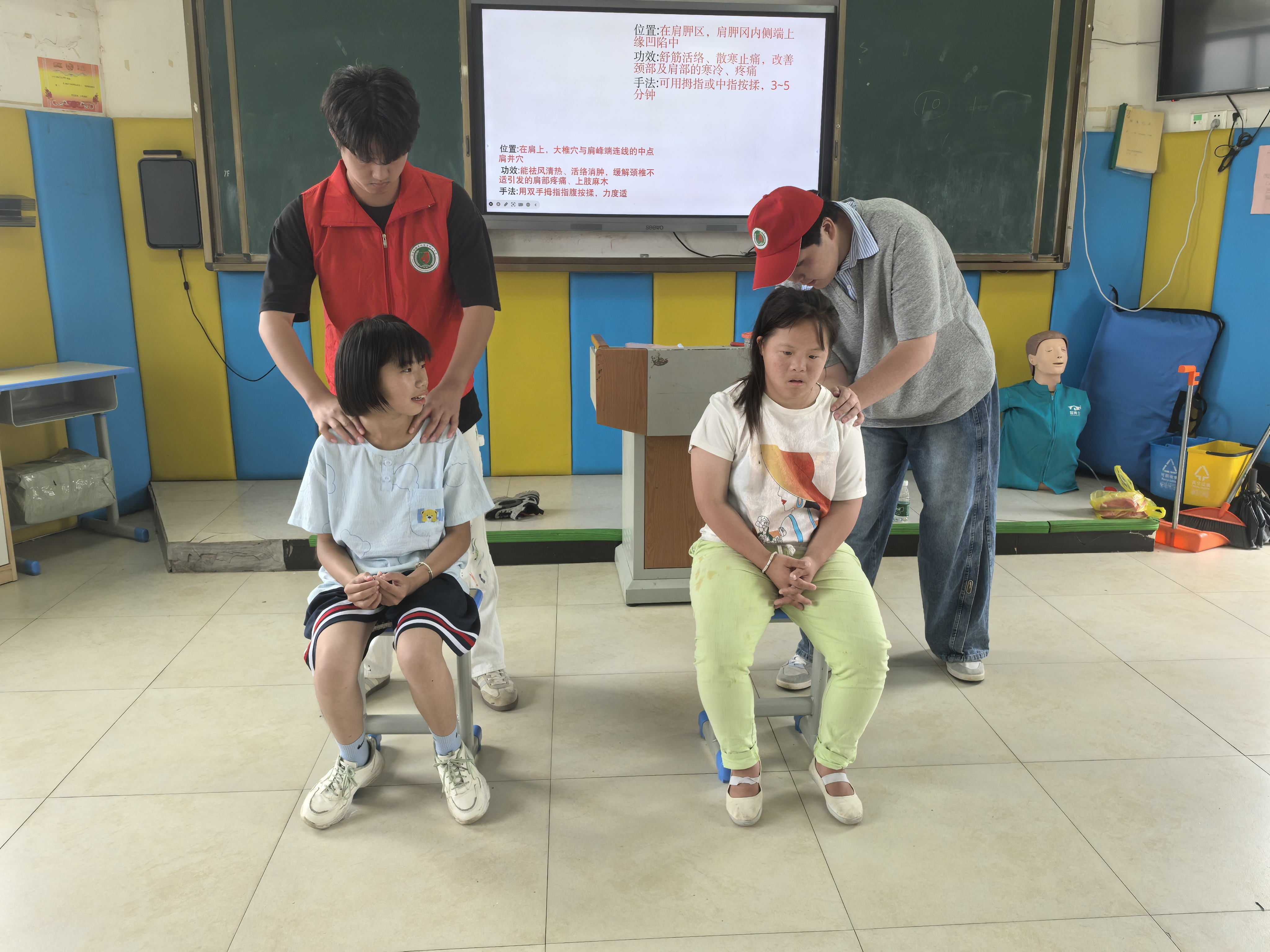 尤为暖心的是,在康复按摩教学环节,志愿者们耐心示范头部、手部、腿部等部位的基础按摩手法,讲解按摩对放松肌肉、促进血液循环的益处,手把手指导学生和老师操作;受伤应急处理课堂上,通过情景模拟,详细演示了伤口包扎、止血、应对突发晕厥等急救方法。课堂上学生和老师们都认真学习、积极实践,收获满满。