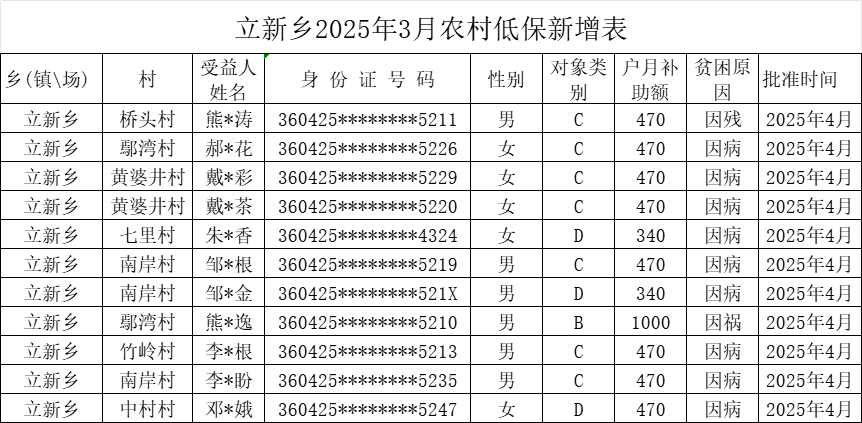 立新乡2025年3月农村低保新增名单