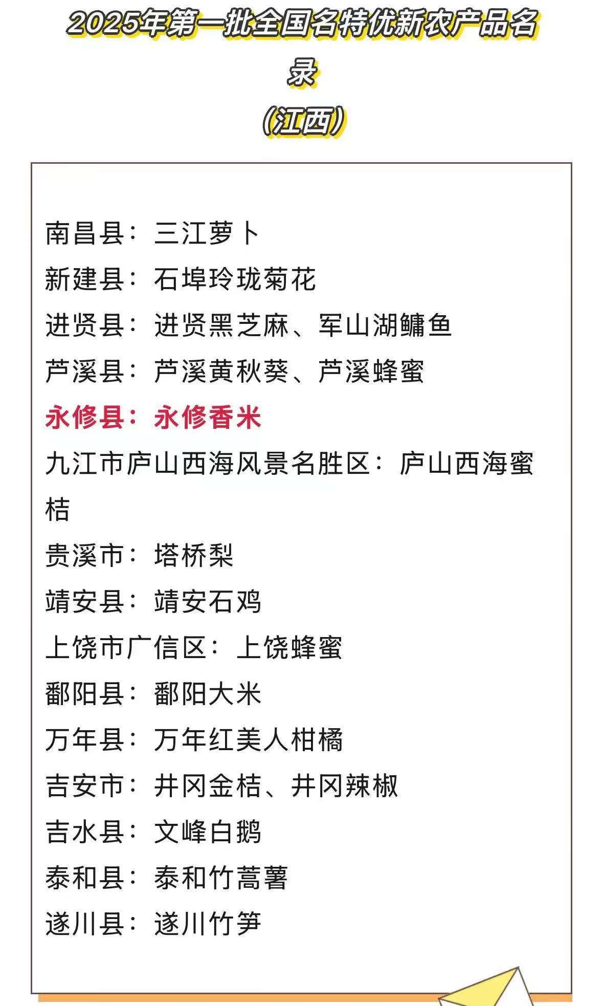近日,在农业农村部农产品质量安全中心公布的《2025年第一批全国名特优新农产品名录》中,江西省有18个名特优新农产品上榜,永修香米位列其中。