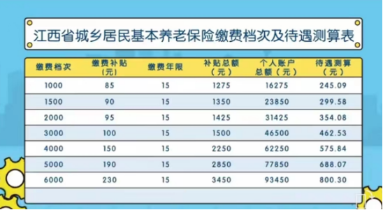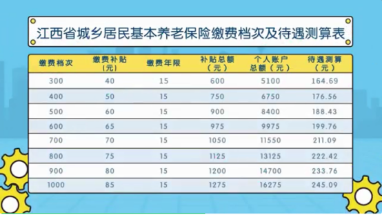 个人年缴费标准为300元、400元、500元、600元、700元、800元、900元、1000元、1500元、2000元、3000元、4000元、5000元、6000元,共十四个档次(通过关注江西税务线上缴费或在各级税务部门办税大厅前台进行缴费)。参保人在设定的最低缴费档次之上,每年自主选择档次缴费,鼓励符合条件的居民尽早参保,选择较高档次连续缴费,多缴多补。补贴标准见下表: