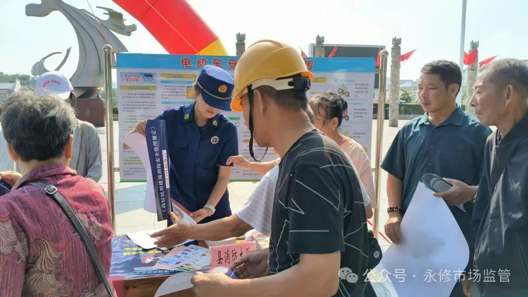 活动现场通过悬挂横幅、摆放展板、发放宣传资料、现场答疑等多种形式,向群众宣传普及电动自行车安全隐患、民生计量、假冒侵权打击以及消防安全等知识及相关法律法规。