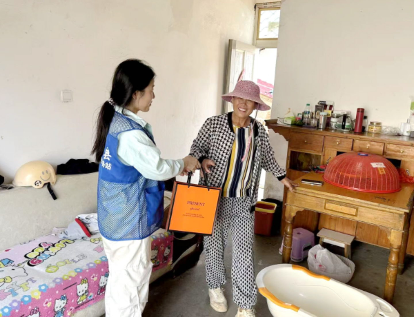 工作人员与志愿者心系特殊群体,带着象征团圆的月饼等慰问品,专程上门走访了辖区老人和留守儿童。
