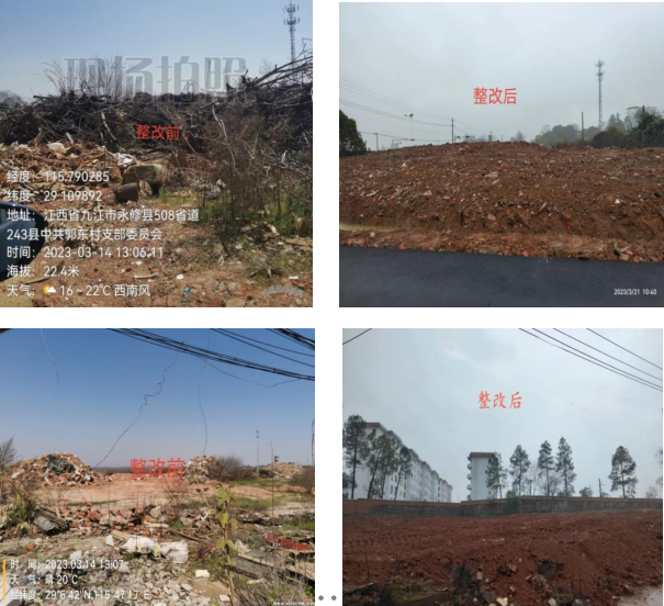 2023年3月中旬,永修县生态环境保护委员会办公室在艾城镇开展生态环境问题“举一反三”帮扶排查行动期间发现:2021年中央生态环境保护督察反馈杨家岭拆迁地块堆放大量建筑垃圾。为防止问题反弹,艾城镇党委、政府高度重视、精心组织、立行立改,仅用3天完成杨家岭拆迁地块建筑垃圾清理、转运,并安装视频监控、安排专人监管。