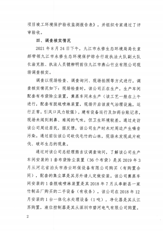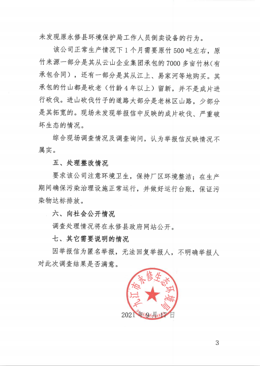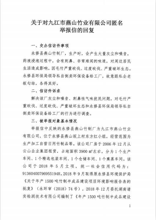 关于对九江市燕山竹业有限公司匿名举报信的回复