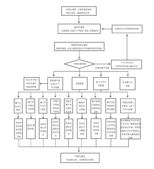 1、本机关收到申请后,将先从形式上对申请的要件是否完备进行审查,对于要件不完备的申请予以退回,要求申请人补正。对申请内容不明确的,将自收到申请之日起7个工作日内一次性告知申请人作出补正,说明需要补正的事项和合理的补正期限。答复期限自行政机关收到补正的申请之日起计算。申请人无正当理由逾期不补正的,视为放弃申请,本机关对该申请将不再予以处理。
