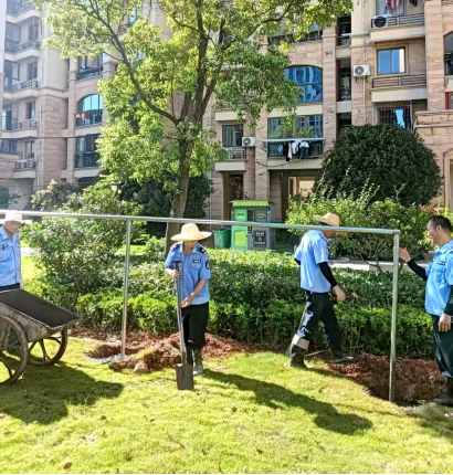 方案落地阶段,康瑞物业主动揽下安装任务。几位物业保安师傅摇身一变成为“安装工”,冒着酷暑实地测量、打桩、固定支架,汗水浸透了工服也毫无怨言。