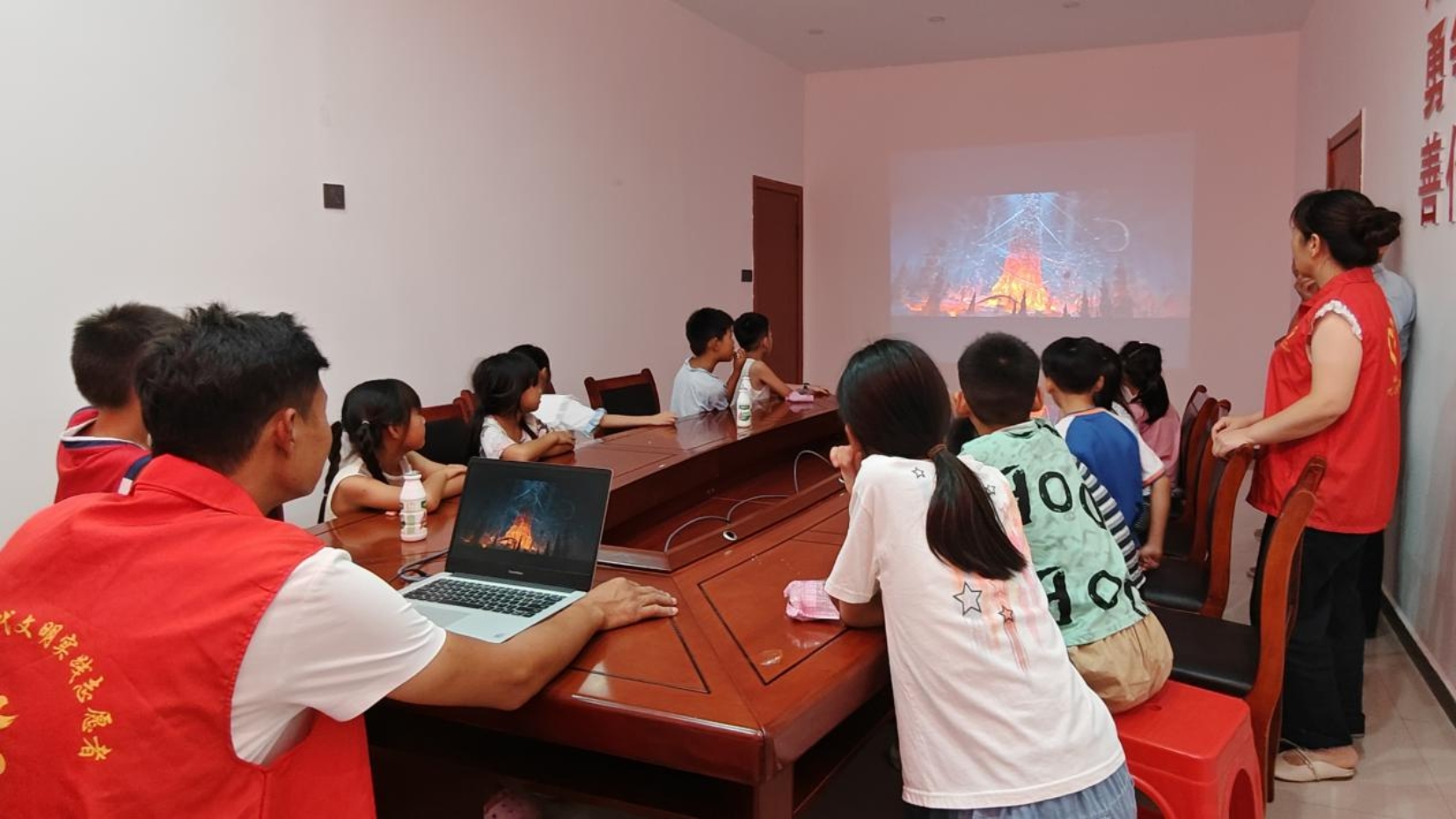 活动现场,志愿者们提前布置好观影场地,调试设备、准备小零食,为孩子营造了温馨舒适的观影氛围。随着影片开始放映,白色墙面上的精彩画面吸引孩子们的目光,现场时而欢笑,时而紧张。影片中哪吒勇敢抗争命运、坚持正义的成长故事,不仅传递了勇敢无畏的积极价值观,也引导孩子们学会勇敢面对困难,珍惜亲情与友情。观影结束后,志愿者们还组织了互动交流,不少孩子表示“和这么多小伙伴一起看电影很开心,下次还想来参加”。